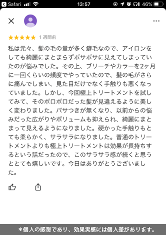 トリートメント髪質改善コースのお客様事例。SHILKでは美容室帰り後のホームケアまでサポート致します。